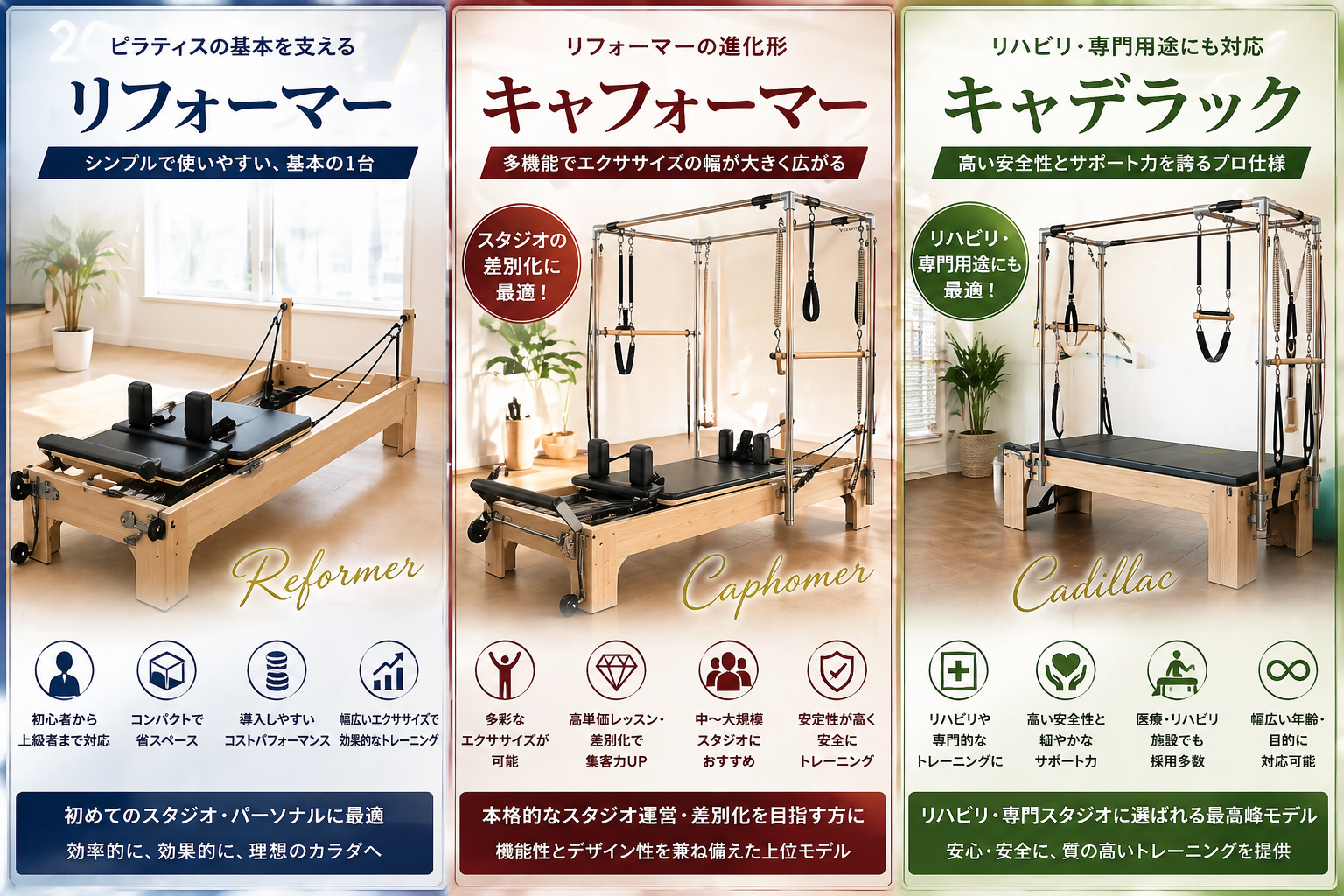 【2026年最新版】ピラティスマシン導入完全ガイド|リフォーマー・キャフォーマー・キャデラックの違いと失敗しない選び方